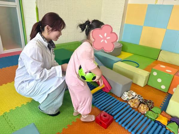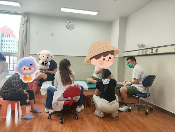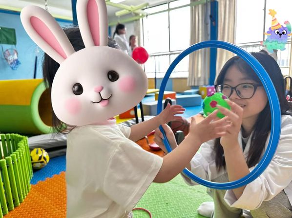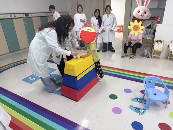 实践初期,团队成员按科室分组,在资深治疗师的指导下深度参与各类康复训练工作。针对感统失调儿童,队员们协助开展平衡、协调类感统训练,通过专业器械引导孩子逐步改善感知统合能力;在肢体功能改善领域,配合完成PT训练,帮助患儿提升肢体活动度与力量;同时,耐心参与言语障碍儿童的沟通引导训练,借助互动游戏激发表达意愿,并辅助开展认知训练,通过趣味任务提升孩子的思维与记忆能力。
